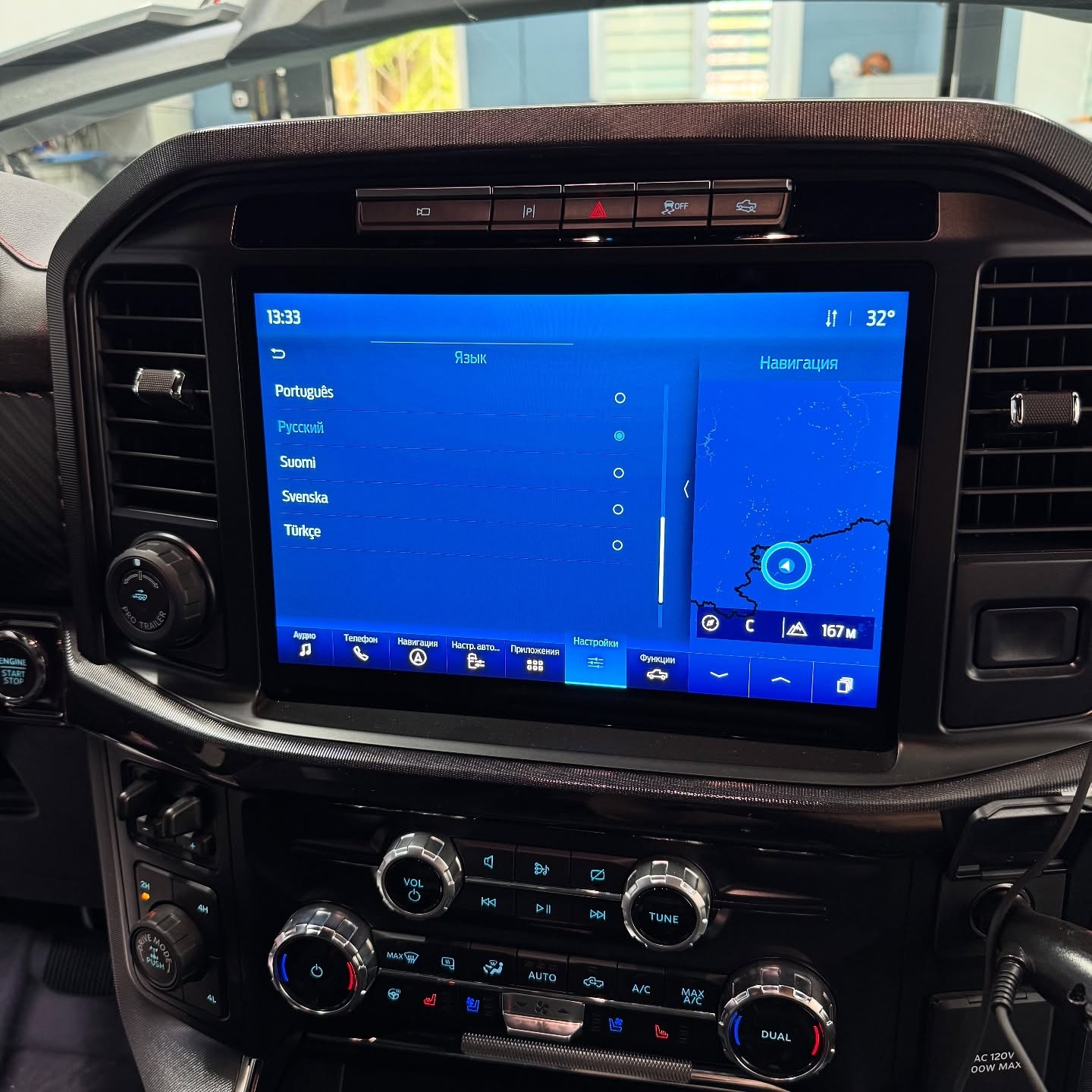 В работе был практически новый Ford Raptor, к сожалению с завода,на автомобиле, не было русского языка, как ни крути, а на английском не совсем удобно и понятно))